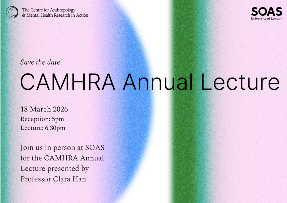 We will also be announcing the recipient of the CAMHRA Annual Book Prize, which highlights and fosters original thought at the intersection of anthropology and mental health research, following the conceptual theme set each year by the CAMHRA Annual Lecture.