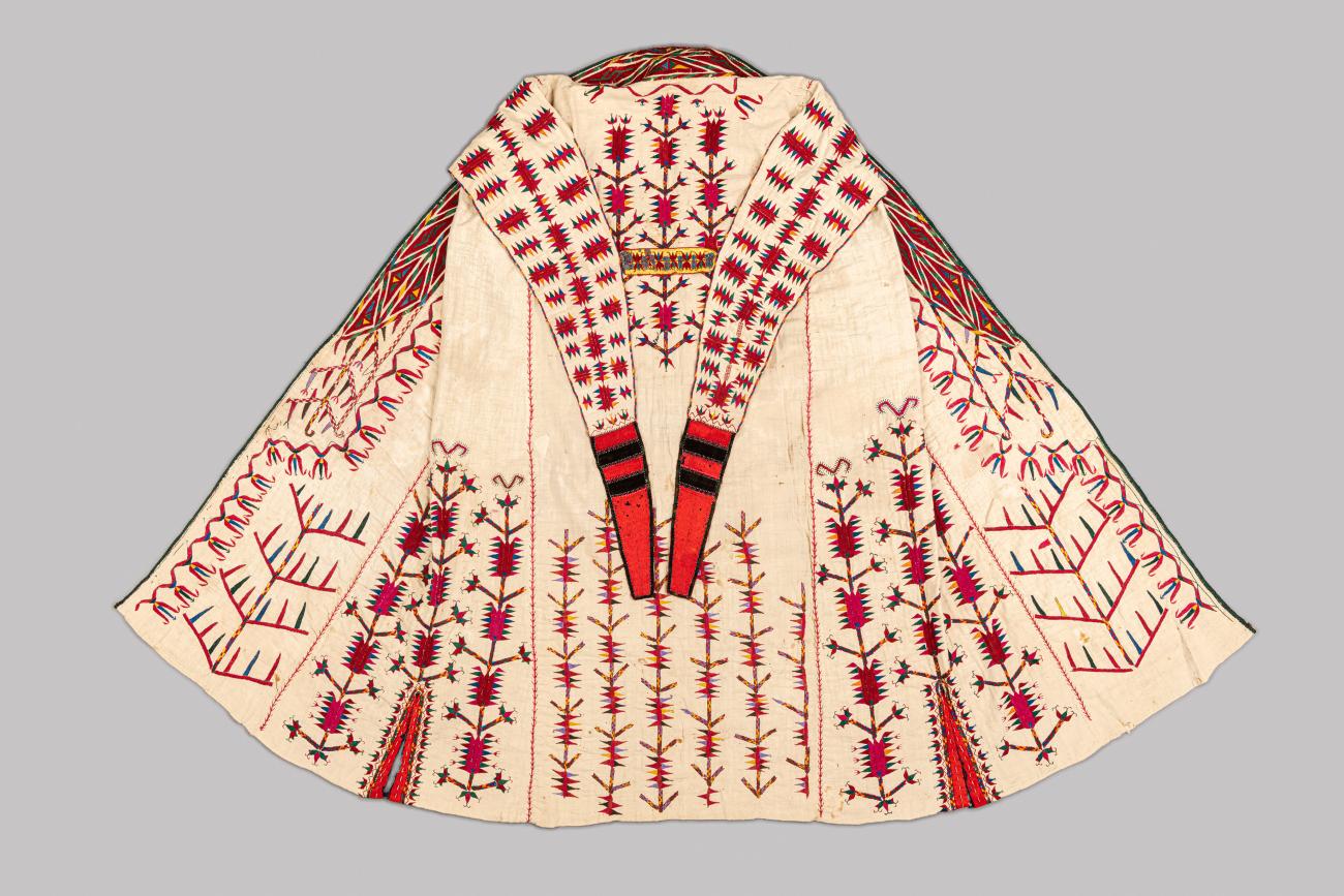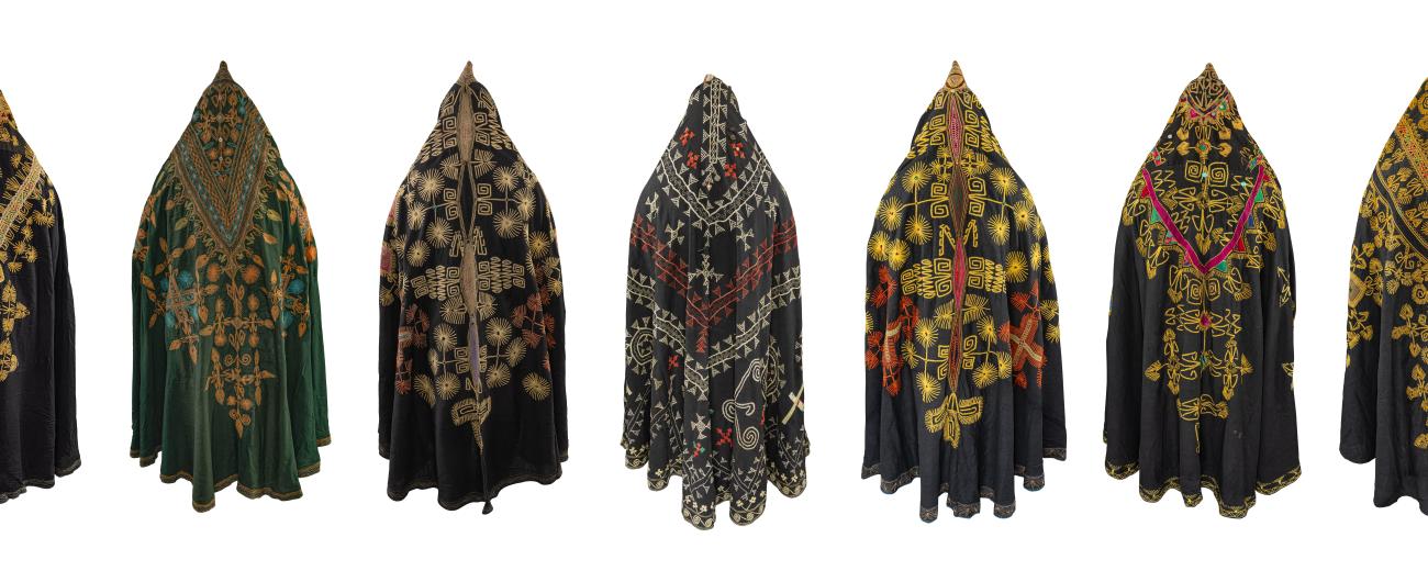 Highlights will include: remarkable nineteenth-century Arabachi coats, embroidered in red on blue; rarely displayed Mangal and Pashai shirts; a collection of bold women’s capes with yellow stitches on a black ground; and an uncommon example of a green Kandahari woman’s face veil, embellished with distinctive khamak (satin stitch) decoration. These will be displayed alongside head coverings for men and women, furnishings for the home, such as the Uzbek suzani, and Lakai decorations, as well as covers for weapons, food wraps, and lengthy turban cloths.