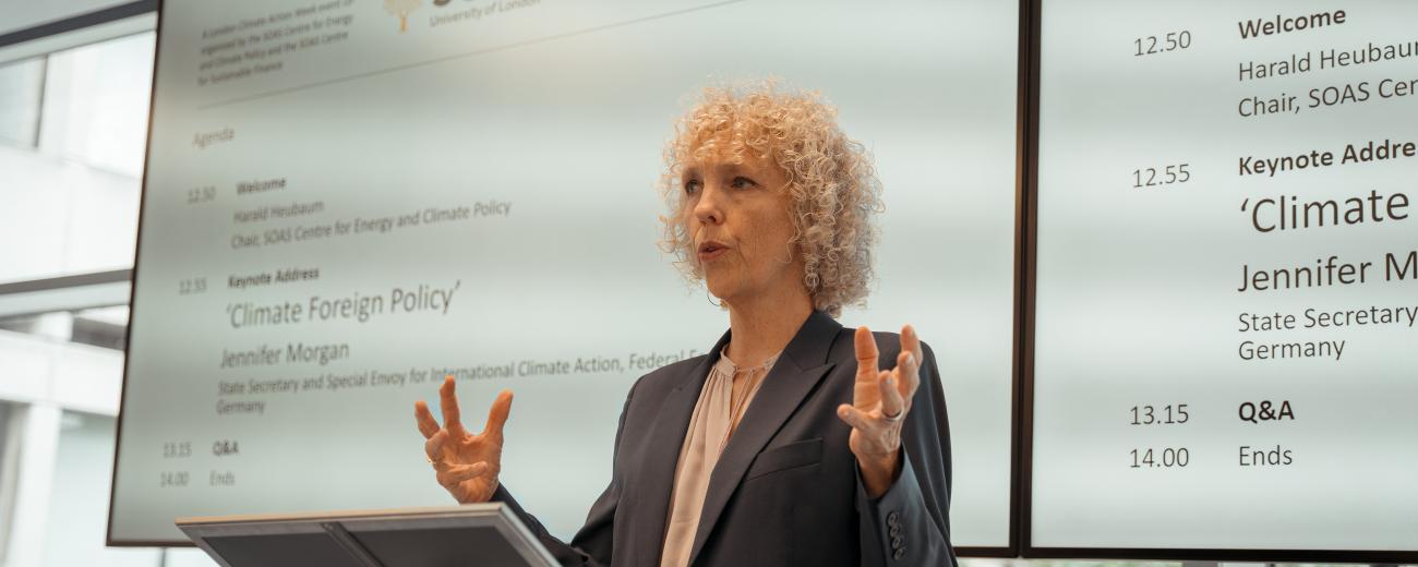 The SOAS Centre for Energy and Climate Policy and the SOAS Centre for Sustainable Finance in cooperation with the Embassy of the Federal Republic of Germany to the United Kingdom hosted a speech and Q&A with Jennifer Morgan, State Secretary and Special Envoy for International Climate Action in the German Federal Foreign Office during London Climate Action Week (LCAW).