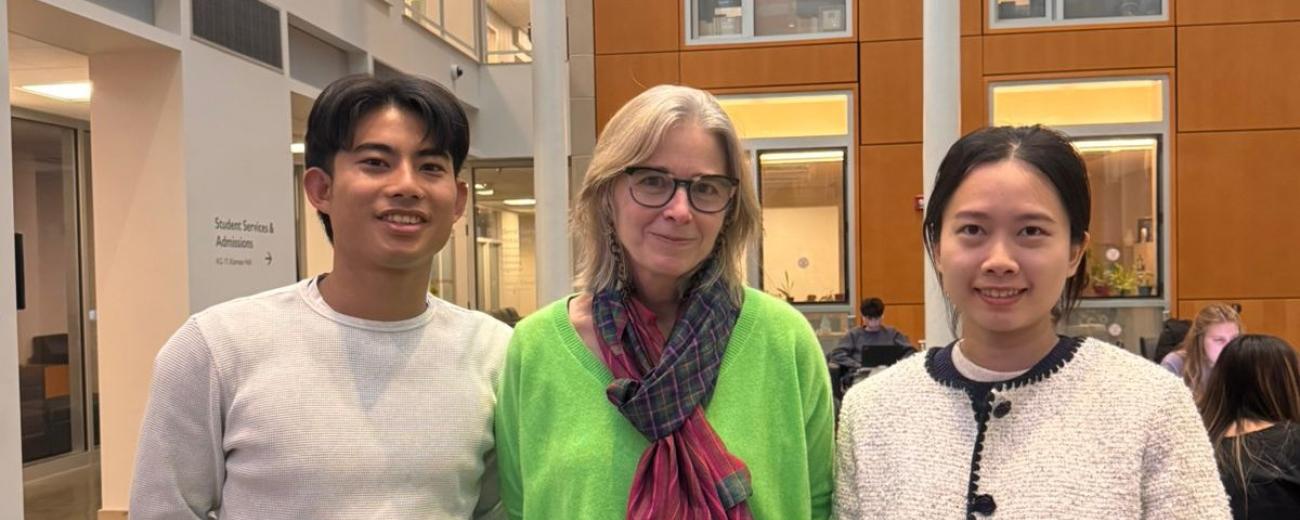 Image: Post-lecture, Ashley Thompson meets with Cornell students Un Mutty and Zhixia Mo, Cornell University. Photo courtesy Zhixia Mo.