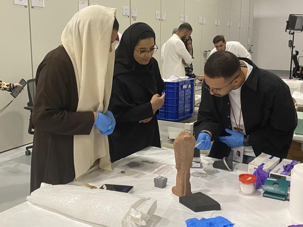 The programme participants with the SOAS instructors; programme participants during one of the object handling and selection sessions. Courtesy of the Royal Commission of AlUla.